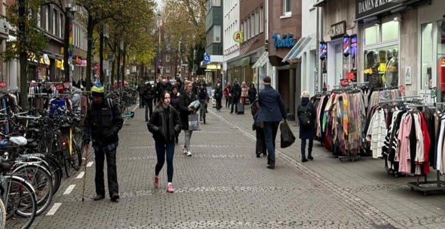 Mit Fahrrädern zugestellte Wegeverbindungen verhindern das Queren aus dem Straßenraum zu den Läden im Erdgeschoß